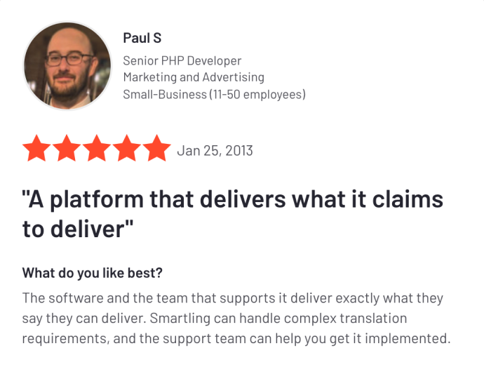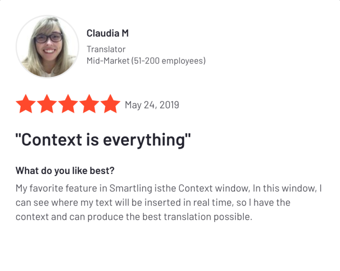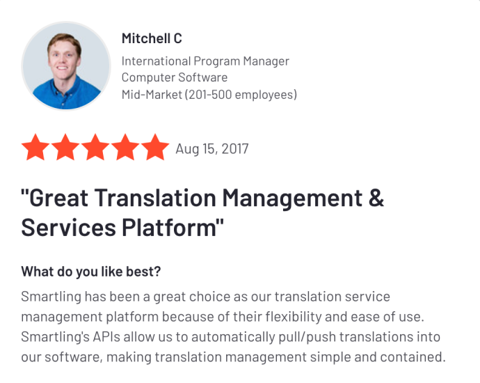 Smartling customers benefit from a robust suite of features and functionality designed to centralize control, simplify collaboration, accelerate turnaround times, and improve translation quality and visibility. See why our customers choose us over the competition.