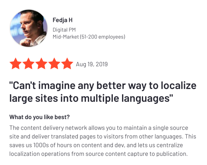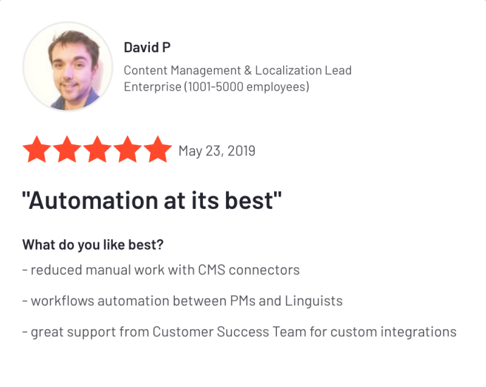 Customers have voted us #1 on G2 for our ability to deliver a translation management solution unlike most other providers on the market. And we’re pretty proud of the growing number of world-class enterprises using us to manage their translation programs from end-to-end.